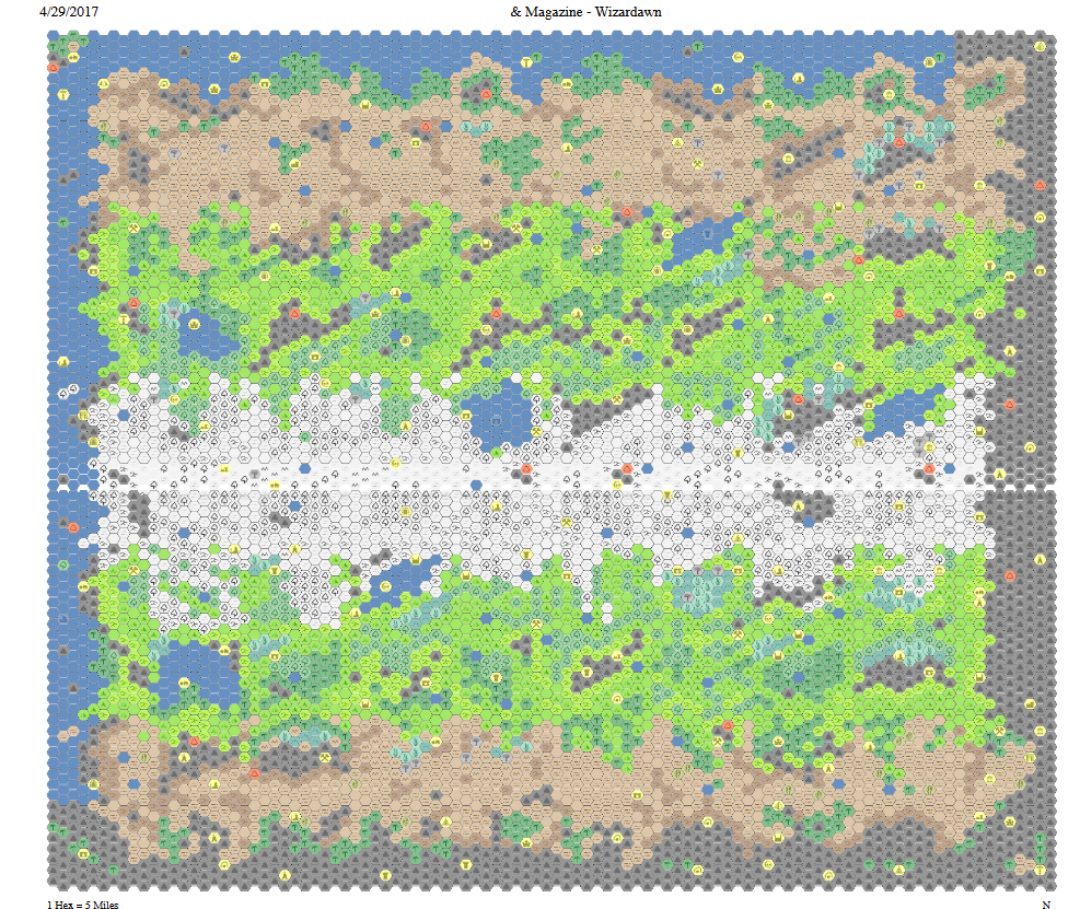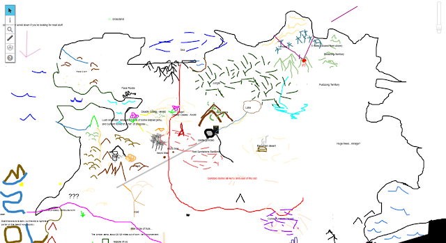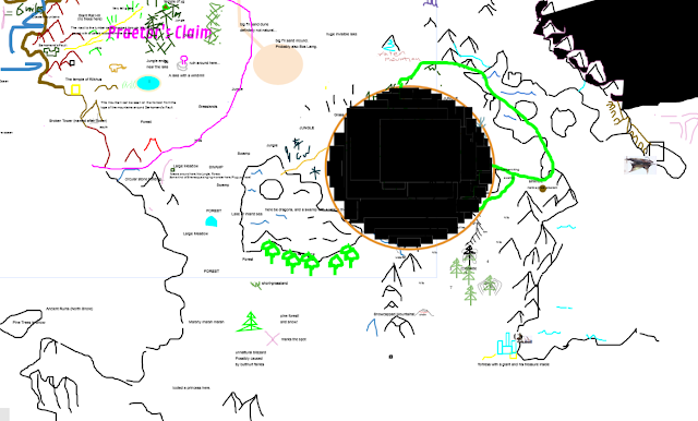 Ultimately I condensed the map to this, and honestly I could have shrunk it to 1/4th the size and I don't think it would have felt crowded. Empty hexes were deleted, consolidated into the same space, flooded by seas and lakes, and generally tossed into the bin. I didn't want the players to find everything because for sandbox exploration to be meaningful there must be the opportunity to NOT find things, but I think even now, it was a little oversized and definitely too empty. There were 1400 hexes, roughly, and about 80 had pre-planned(but not entirely finished or even begun) stuff in them. With that distribution of content, it was almost more of a pointcrawl than a hexcrawl. Travel as adventure gets old when travel is a required adventure between EVERY adventure.