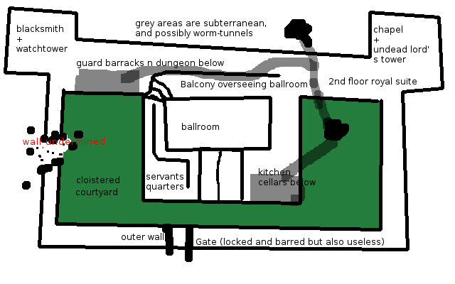 And the halfassed map. Remember those paintings and statues that hint at the holy sword! Heck, a questgiver in the nearby settlement wouldn't be out of order. And recall that the worm-tunnels also lead down to the next level, as does the barracks dungeon and the cellar.