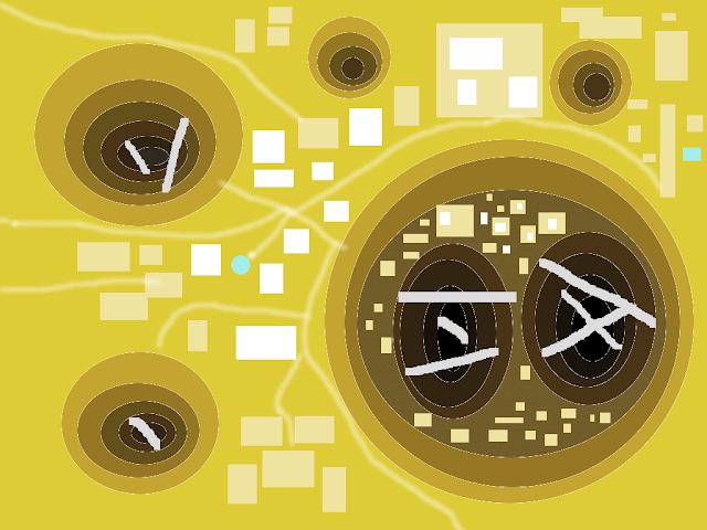 The most prominent pit is huge. A village could be dropped down it, and that's exactly what the people of Simurk did. The first two layers are farmland- protected from the winds of the desert by ducking below them, and fueled by animal dung and terrible, terrible soil in which very hardy plants eke out a living. These farms do not feed Simurk, they only flavor imported foods. Bitter spices and ornamental desert flowers are all that can survive on the levels of the mines.